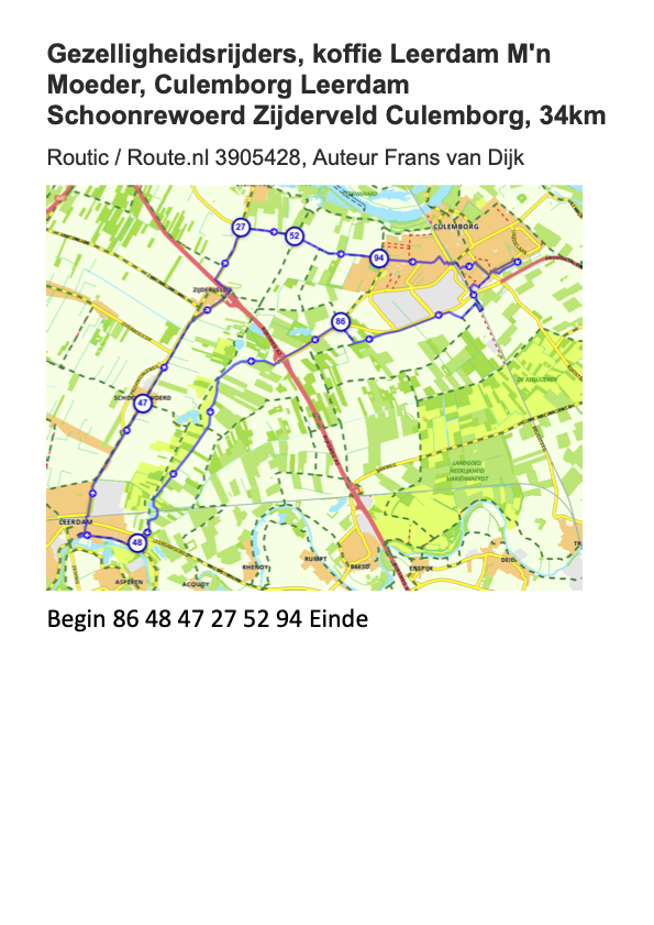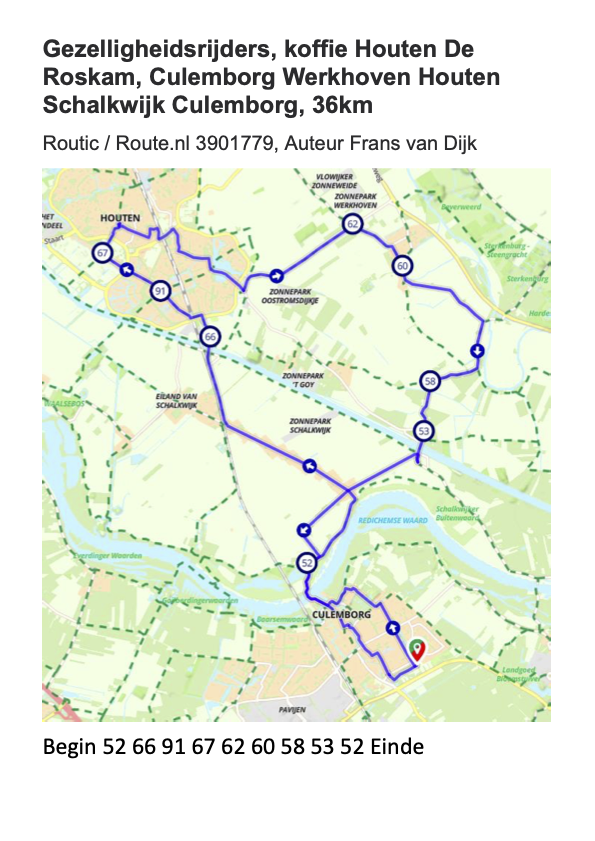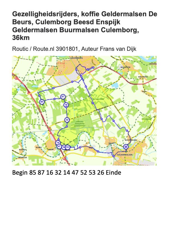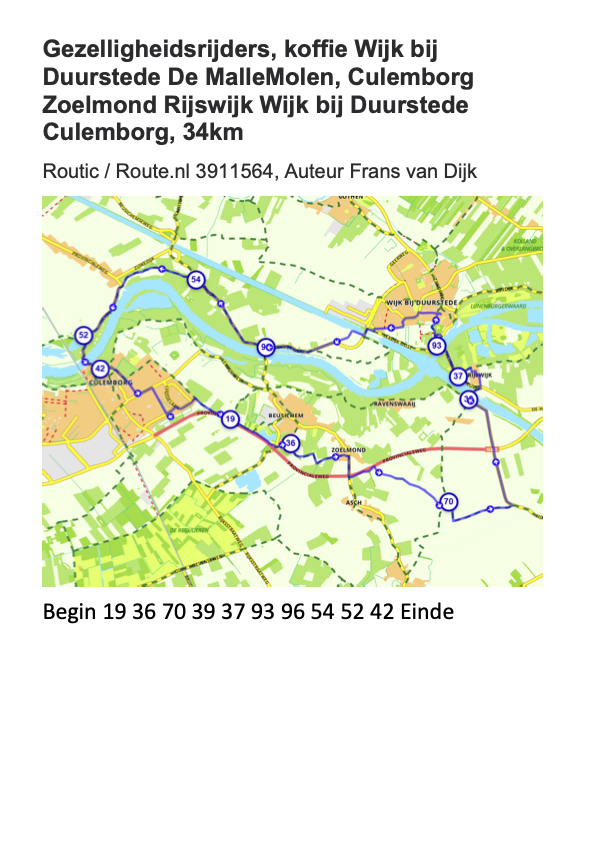 Per route staat het Routiq nummer vermeld (zoals gebruikt op de website route.nl, meer dan 100.000 gratis fiets- en wandelroutes). Op de route.nlwebsite staan trouwens nog veel meer voorbeeldroutes. Ook is per route een PDF bestand beschikbaar voor mensen die de route “op papier” willen hebben. Verder is het gpx bestand beschikbaar dat bijvoorbeeld bruikbaar is in apps als Komoot, Routiq, GPX-viewer, etc.