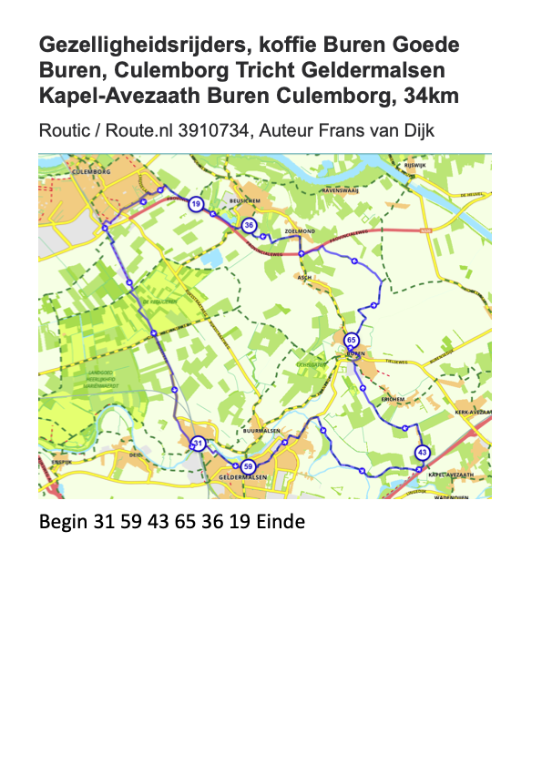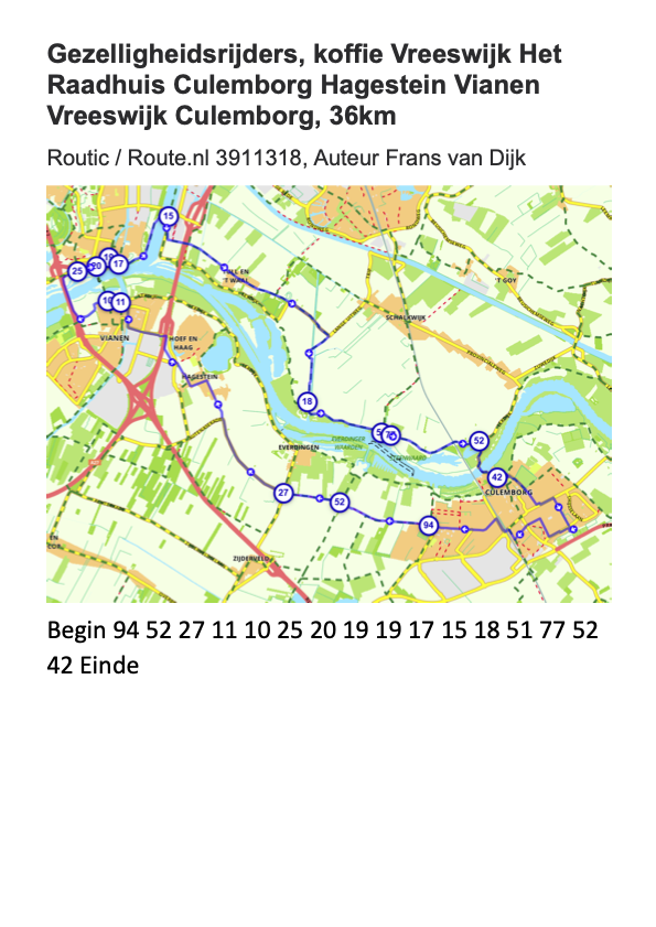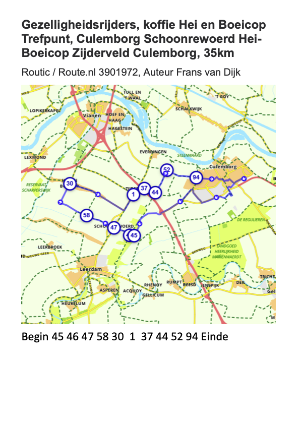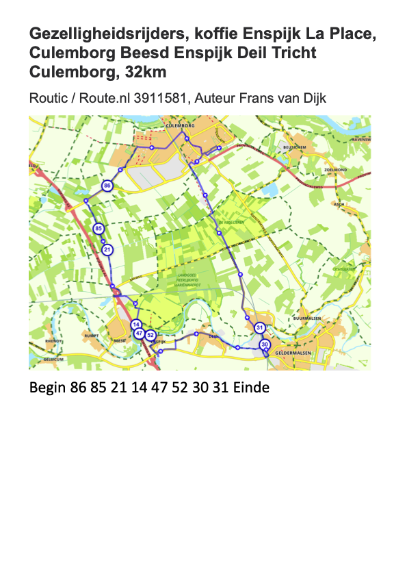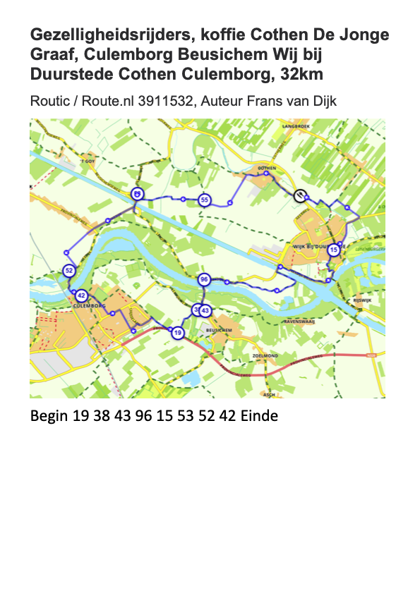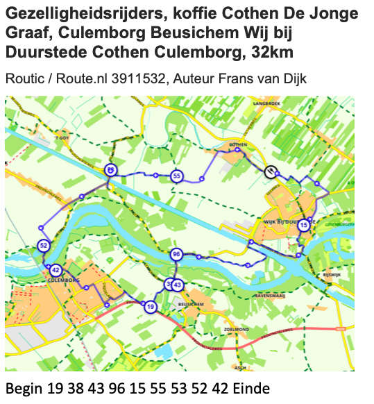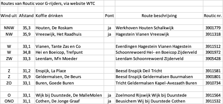 Op dit tab blad van de WTC website (WTC Culemborg – Wielertoerclub Culemborg ) is een aantal voorbeeldroutes beschikbaar. Het zijn routes die g-rijders wel eens op de dinsdag- en de donderdagmiddagen fietsen. Voor g-rijders die het moeilijk vinden om zelf een route te verzinnen, kunnen deze routes helpen om inspiratie op te doen.
